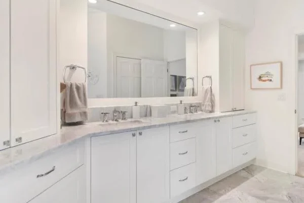 The only bathroom that got new cabinets was the primary bath. To save some money and limit the number of cabinets we were throwing in a landfill, we kept the other cabinets and painted them. As they were all 30” tall, we added 6” mitered edge quartz countertops. Old cabinets; updated look.